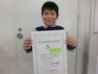 2月に行われたそろばん検定で、見事「珠算3級」に合格した小学2年生の生徒さん。